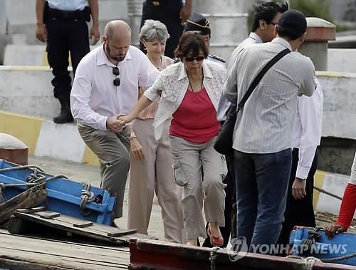 | △ (AP=연합뉴스 자료사진) 인도네시아 중부 자바주(州) 칠리차프의 누사캄방안 섬 교도소에 수감된 호주인 사형수 앤드루 챈의 어머니 헬렌(가운데)이 지난달 아들의 두 번째 면회 길에 나서 누사캄방안 섬으로 향하는 배에 오르고 있다. 누사캄방안 교도소에는 현재 외국인 9명을 포함해 마약사범 사형수 11명이 수감돼 있으며 곧 사형이 집행될 예정이다. |