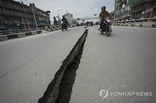△ 두 동강 난 네팔 도로 (박타푸르<네팔> EPA=연합뉴스) 26일(현지시간) 네팔 카트만두 인근 박타푸르 지역의 도로가 대지진으로 인해 반으로 갈라져 있다.
