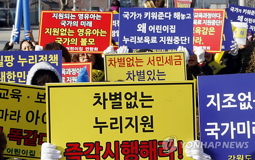 (전국=연합뉴스) 전북과 강원에서 어린이집 누리과정(만 3∼5세 무상교육) 예산 가운데 일부 지원이 중단되면서 이같은 상황이 다른 지역으로 확산될 수 있다는 우려가 커지고 있다.