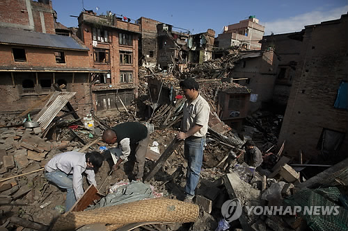 | △ 네팔 대지진 현장 (카트만두 AP=연합뉴스) 대지진이 강타한 네팔 수도 카트만두 교외 박타푸르에서 27일(현지시간) 한 가족이 폐허 속에서 쓸 만한 가재도구를 찾고 있다. |