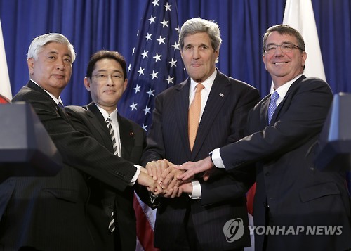 미국과 일본은 27일(이하 현지시간) 미국 뉴욕 월도프 아스토리아 호텔에서 존 케리 미 국무장관, 애슈턴 카터 미 국방장관, 기시다 후미오 일본 외무상, 나카타니 겐 일본 방위상이 참석한 가운데 외교·국방장관 연석회의(2+2)를 열어 이 같은 내용을 담은 새로운 미·일 방위협력지침(가이드라인)을 확정했다.