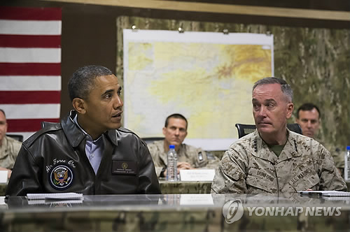 | △ President Barack Obama, left, speaks during a briefing by Marine General Joseph Dunford, commander of the US-led International Security Assistance Force (ISAF), after arriving at Bagram Air Field for an unannounced visit, on Sunday, May 25, 2014, north of Kabul, Afghanistan. (AP Photo/ Evan Vucci) |