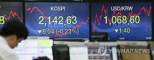 △ 코스피 나흘 연속 하락, 원·달러 환율 1.4원 내려 (서울=연합뉴스) 박지호 기자 = 코스피가 29일 외국인과 기관의 동반 순매도에 4거래일 연속 하락했다. 이날 코스피는 전날보다 5.04포인트(0.23%) 내린 2,142.63으로 마감했다. 한편 서울 외환시장에서 원·달러 환율은 달러당 1.4원 내린 1,068.6원으로 마감했다. 사진은 29일 오후 서울 을지로 외환은행 본점 딜링룸의 모습.