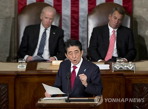 △ 아베 총리, 미 의회 합동연설 (워싱턴 AP=연합뉴스) 미국 의회에서 아베 신조 일본 총리가 과거 제국주의 식민 지배 피해국인 한국과 중국 등에 대해 분명한 사과 없이 미국에만 고개를 숙이는 이중적 태도를 드러냈다. 아베 총리는 29일(현지시간) 오전 미국 하원 본회의장에서 상하원 합동연설의 무대에 섰다. 상원의장인 조 바이든 부통령(왼쪽)과 존 베이너 하원의장이 듣고 있다.