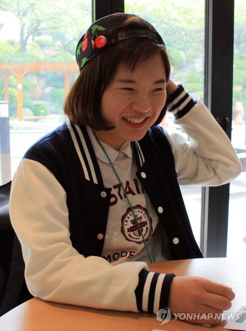 △ 14살 최연소 전문대생 박초운양 (부산=연합뉴스) 민영규 기자 = 올해 전국 전문대 최연소 입학생인 부산경상대 호텔관광경영과 박초운(14·가운데)양이 30일 캠퍼스 카페에서 장래희망을 얘기하며 겸연쩍은 표정을 짓고 있다. 2015.4.30 youngkyu@yna.co.kr
