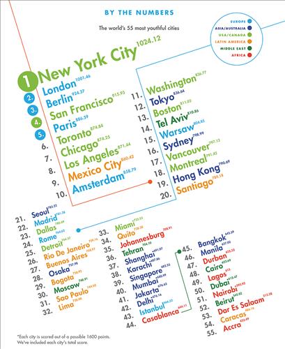 이어 런던, 베를린, 샌프란시스코, 파리 등의 순으로 2~5위에 올라 젊은 층이 지내기 좋은 도시로 꼽혔다.