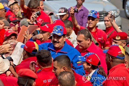 △ 니콜라스 마두로 베네수엘라 대통령이 지난 1일(현지시간) 노동절 연설에서 최저임금 인상을 결정한뒤 지지자들에게 둘러싸여있다.(AP=연합뉴스DB)