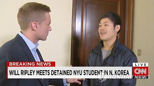 | △ 북한 억류 한인 대학생 주원문씨, CNN과 인터뷰 (서울=연합뉴스) 북한이 불법입국 혐의로 체포해 억류한 미국 한인 대학생 주원문(21) 씨가 남북관계에 좋은 영향을 끼치고 싶어 자진 입북했다고 밝혔다. 5일(현지시간) 미국 CNN방송에 따르면 뉴욕대 학생인 주 씨는 4일 이 방송과 평양 고려호텔에서 한 인터뷰에서 "불법인 것을 알지만 나의 입북을 통해 멋진 일들이 일어날 수 있다고 생각했고 이런 일들이 남북관계에 좋은 영향을 줄 것이라고 기대했다"고 말했다. (CNN 캡쳐) |
