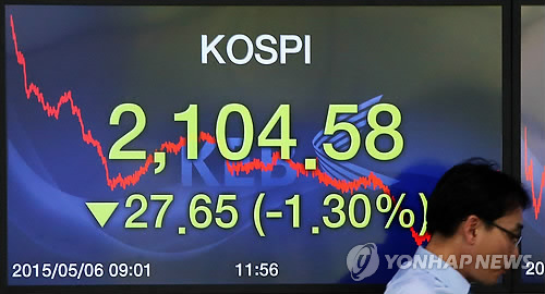 이날 코스피는 전 거래일보다 27.65포인트(1.30%) 내린 2,104.58로 장을 마쳤다. 하락폭은 지난 1월 6일(1.74%) 이후 가장 큰 수준이다.