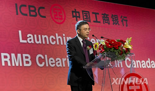 △ 지난 3월 중국공상은행이 캐나다 토론토에 가진 위안화 청산은행 오픈 기념식 모습(자료사진)