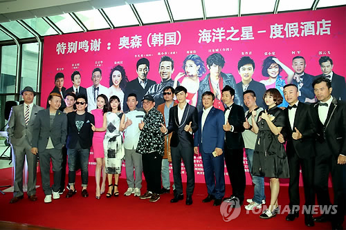△ 제주서 제작발표회 하는 중국 코메디 영화 (서귀포=연합뉴스) 고성식 기자 = 제주에서 촬영 중인 중국의 액션·코메디 영화인 '메이지화'(바보계획)의 투자·제작사와 출연진·스태프들이 7일 서귀포시 오션스타콘도에서 제작발표회를 열고 카메라 촬영에 포즈를 취하고 있다. 왼쪽에서 네 번째 한국배우 이범수, 왼쪽에서 일곱 번째와 여덟 번째가 각각 배우 천소췬과 감독 썬다오.