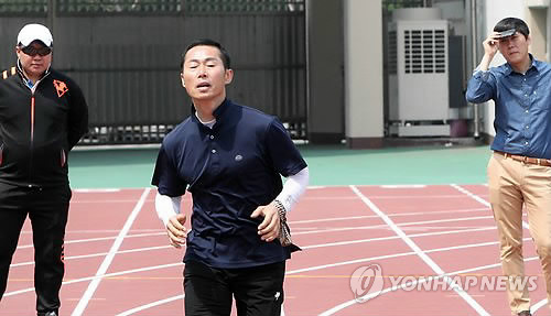 △ 끝까지 뛰어보자 (청주=연합뉴스) 김형우 기자 = 7일 오전 청주시 종합운동장에서 이뤄진 청주 동부소방서 소방관들의 체력평가에서 한 50대 소방관이 왕복달리기를 하고 있다. 2015.5.7 vodcast@yna.co.kr