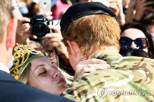 (서울=연합뉴스) 백나리 기자 = 호주 시드니를 방문한 영국 해리(30) 왕자에게 장난감 왕관을 쓴 20대 현지 여성팬이 나타나 기습키스하는 해프닝이 빚어졌다.
