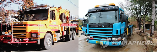 △ (부산=연합뉴스) 차령이 30년이 넘은 특수구난용 대형 렉카(왼쪽)의 외형이 최신 모델처럼 불법 개조돼 영화 '페이스 오프'를 연상하게 한다. 2015.5.7 << 부산지방경찰청 제공 >> youngkyu@yna.co.kr
