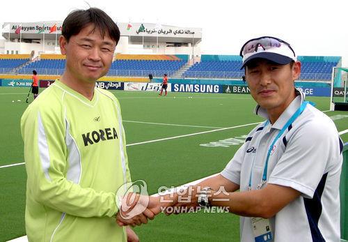 | △ 유승진 전 감독이 일본 여자대표팀 수석 코치로 근무하던 2006년 12월 1일 카타르 도하의 훈련장에서 한진수 당시 한국여자하키 대표팀 감독(왼쪽)과 악수하고 있다. |