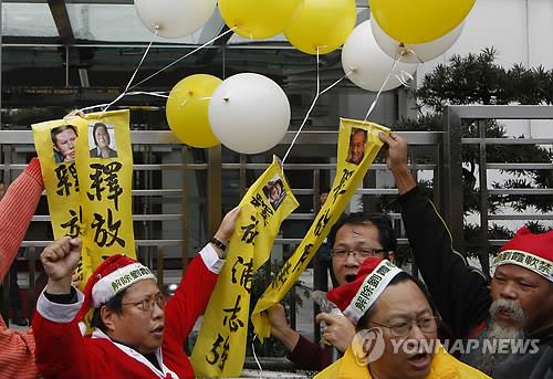 | △ (AP=연합뉴스) 지난해 성탄절인 12월 25일 홍콩주재 중국연락판공실 밖에서 산타클로스 복장의 반중 시위자들이 노벨평화상 수상자인 류샤오보(劉曉波), 변호사 푸즈창(浦志强) 등 투옥된 중국 인권운동가들의 사진을 단 풍선을 들고 이들의 석방을 요구하며 농성을 벌이고 있다. |