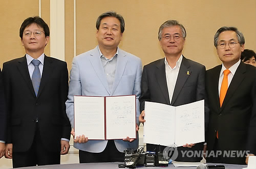 △ 지난 2일 국회에서 '공무원연금 개혁 및 국민연금 강화를 위한 양당 대표 합의문'을 발표하고 있다. (연합뉴스 자료사진)