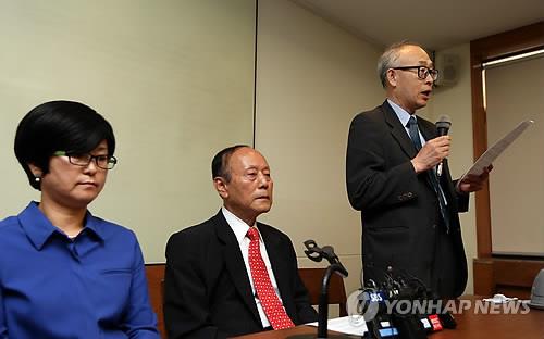 | △ '광복 70년, 615 15년' 남북회의 결과 발표 (서울=연합뉴스) 신준희 기자 = 8일 오후 서울 중구 프란치스코 교육회관에서 열린 '광복70돌, 615공동선언 발표 15돌 민족공동행사 준비위원회' 기자회견에서 상임대표인 이윤배 흥사단 이사장이 남북 합의 결과를 발표하고 있다. 왼쪽부터 김금옥 한국여성단체연합 상임대표과 이창복 615남측위 상임대표. |