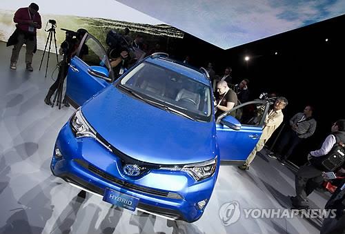 | △ 2015년 4월 2일(현지시간) 미국 뉴욕에서 열린 자동차쇼에 도요타의 하이브리드 차 RAV4가 전시돼 있다.(AP=연합뉴스DB) |