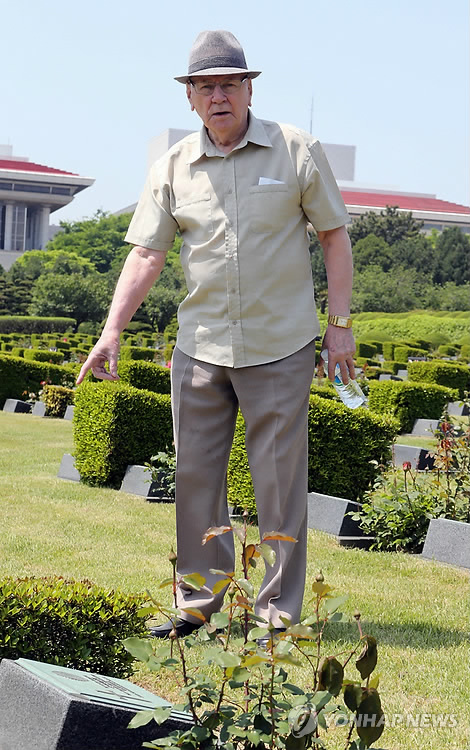 △ (부산=연합뉴스) 조정호 기자 = 6·25전쟁 때 영국군으로 참전한 제임스 그룬디(83) 씨가 부산시 남구 유엔기념공원을 찾아 묘지를 둘러보고 있다. 27년간 자비로 매년 부산을 찾은 그룬디 씨는 말기암환자로 이번이 마지막 방문이다. 2015.5.9 ccho@yna.co.kr