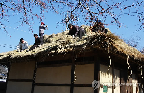 △ 겨울채비하는 정지용 생가 (옥천=연합뉴스) 충북 옥천군 옥천읍 정지용(鄭芝溶) 시인의 생가에서 19일 초가지붕의 이엉을 교체하는 작업이 한창이다. 2014.11.19 <<옥천군 제공>> bgipark@yna.co.kr