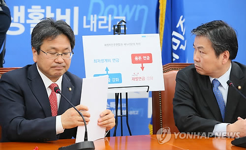 △ 소득대체율 50% 진실은? (서울=연합뉴스) 진성철 기자 = 새정치민주연합 강기정 공무원연금개혁특위 야당 간사(왼쪽)와 홍종학 의원이 8일 국회에서 열린 '세대간 도적질 및 소득대체율 50% 진실 간담회'에서 굳은 표정을 짓고 있다. 2015.5.8 zjin@yna.co.kr