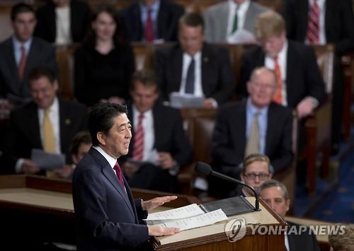 | △ 미 의회에서 연설하는 아베 총리(AP.연합뉴스) |