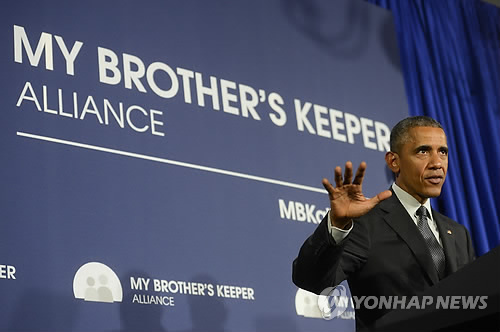 | △ (뉴욕 AP/더 데일리 뉴스=연합뉴스) 볼티모어 흑인청년 사망에 따른 폭동사태로 흑인 젊은이들의 열악한 교육과 빈곤에 대한 미국사회의 관심이 재부각된 가운데 버락 오바마 대통령이 '내 형제의 보호자'(My Brother's Keeper) 프로그램 강화계획을 4일(현지시간) 발표했다. '내 형제의 보호자'라는 명칭은 구약 창세기 4장의 8∼9절에서 카인이 질투심에 동생 아벨을 죽이고 하나님에게 '내가 내 아우를 지키는 자이니까?'(Am I My Brother's Keeper?) 라고 말한 구절 중에서 역설적으로 따온 것. 사진은 이날 오바마 대통령이 뉴욕주 리먼컬리지의 독립적 비영리단체 '내 형제의 보호자 연합' 창설 행사에서 연설하는 모습. |