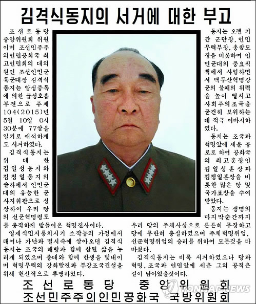 △ 김격식 북한 전 인민무력부장 사망 (서울=연합뉴스) 북한 인민무력부장을 역임한 김격식(77) 인민군 대장이 사망했다고 북한 노동당 기관지 노동신문이 11일 보도했다. 사진은 노동신문에 실린 김격식의 부고다. 김격식 전 부장은 북한 군부내 대표적인 강경파 인물로 4군단장이었던 지난 2010년 천안함 폭침사건을 주도한 배후로 지목된 인물이다. 2015.5.11 nkphoto@yna.co.kr