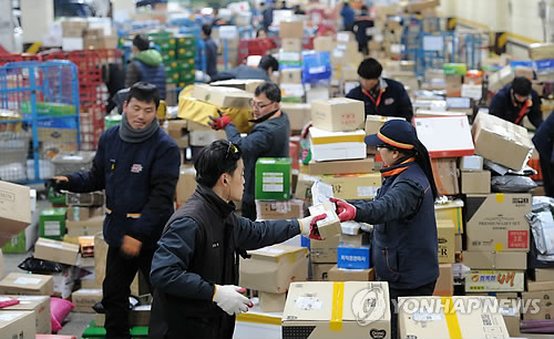 △ 우체국 직원들이 분주히 택배 상자들을 처리하고 있다.(연합뉴스 자료사진)