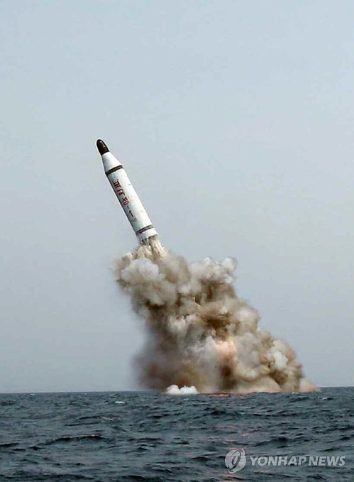 | △ 북한 전략잠수함서 탄도탄 '북극성' 발사 (서울=연합뉴스) 북한은 9일 전략잠수함의 탄도탄 수중시험발사에 성공했다고 밝혔다. 노동당 기관지 노동신문은 이날 "김정은 동지의 직접적인 발기와 세심한 지도 속에 개발완성된 우리 식의 위력한 전략잠수함 탄도탄 수중시험발사가 진행됐다"고 보도했다. 사진은 신문에 공개된 탄도탄의 모습. 붉은색 커다란 글씨로 '북극성-1'이라고 적혀있다. 한·미 정보당국은 탄도탄을 'KN-11'로 명명한 것으로 알려졌다. |