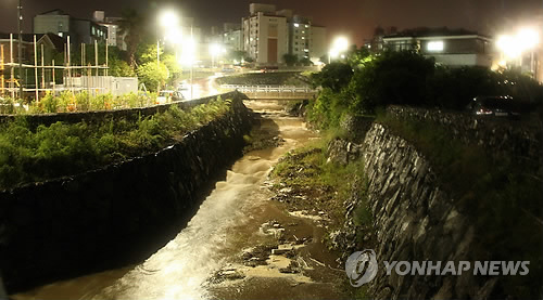 △ (제주=연합뉴스) 김승범 기자 = 11일 제주지역에 강풍을 동반한 많은 비가 내려 한라산에 최고 420㎜ 넘는 비가 내린 가운데 평소 마른 하천이던 제주시 아라동 산지천 중류에 한라산에서 내린 빗물이 모여 흐르고 있다. 2015.5.11 bjc@yna.co.kr