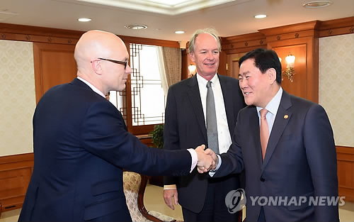 △ 악수하는 최경환 부총리와 무디스 글로벌 국가신용등급 총괄 (서울=연합뉴스) 최경환 부총리 겸 기획재정부 장관이 12일 정부서울청사에서 알라스테어 윌슨 무디스 글로벌 국가신용등급 총괄과 면담에 앞서 악수하며 인사를 나누고 있다. (기획재정부 제공)