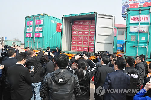 △ 지난 3월 20일 칭다오 지모시 세관에 중국 소비자들이 한국 인터넷쇼핑몰에 주문한 물품들이 페리선을 통해 처음으로 들어왔다.(연합뉴스 자료사진)