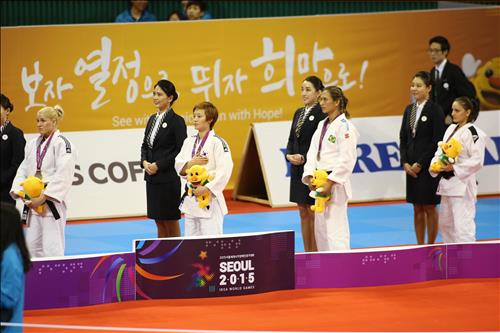 | △ 2015 서울 세계시각장애인경기대회 유도 여자 57kg급 우승자 서하나(왼쪽에서 두 번째)가 시상대 가장 높은 곳에 섰다. <2015 서울 세계시각장애인경기대회 조직위원회 제공> |