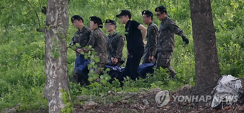 | △ 들 것에 실린 총기 난사 예비군 (서울=연합뉴스) 한종찬 기자 = 13일 오전 예비군 사격훈련중 총기 사망사고가 발생한 예비군 훈련장에서 군 관계자들이 총기를 난사하고 자살한 최모씨의 시신을 들고 이동하고 있다. |