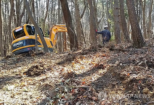| △ 중장비 동원된 무단벌목 (부산=연합뉴스) 김선호 기자 = 부산의 유일한 동물원인 삼정 더파크 개장 전인 2014년 1월 23일. 에코빌리지 건물 뒤편 2차 부지에 굴삭기가 동원돼 나무를 송두리째 뽑아내는 무단벌목이 이뤄지고 있다. 그동안 삼정더파크 시공사와 허가권자인 부산진구, 부산시는 무단벌목이 없었다고 발뺌해왔다. 2015.5.7 wink@yna.co.kr |