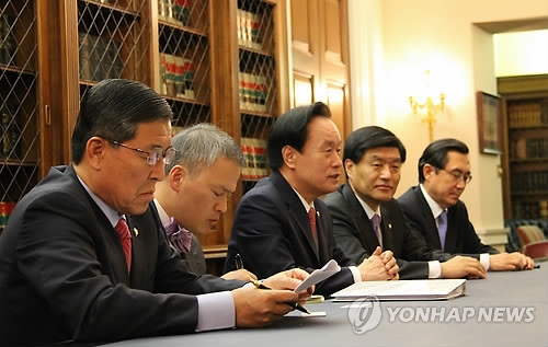 회장인 새누리당 이병석 의원을 단장으로 하는 국회 한미의원외교협의회 대표단은 이날 오전 미국 의사당옆 롱워스 빌딩에서 미국 의회의 미한의원외교협의회의 초대 공동회장인 피터 로스캠(공화·일리노이)·마이크 켈리(공화·펜실베이니아) 연방 의원과 회동했다.