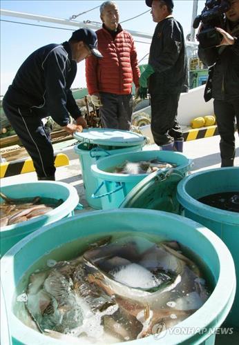 △ 2013년 10월 일본 후쿠시마현 이와키지구 조합 어민이 잡아올린 수산물(교도.연합뉴스.자료사진)