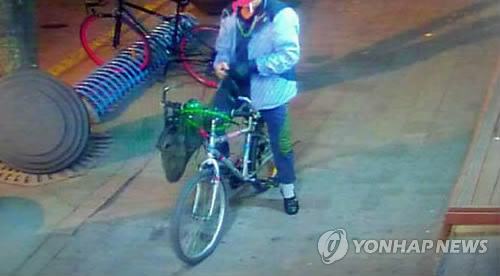 | △ 자전거를 훔쳐 달아나는 피의자 (청주=연합뉴스) 청주 상당경찰서는 수개월간 상습적으로 자전거를 훔친 혐의(상습절도)로 이모(54)씨를 구속했다고 14일 밝혔다. 사진은 이씨가 자전거를 훔쳐 달아나는 모습이 촬영된 CCTV 장면. 2015.5.14 <<청주 상당경찰서 제공>> vodcast@yna.co.kr |