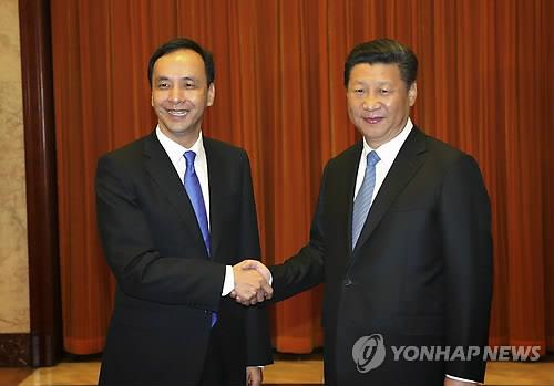 △ 지난 4일 시진핑 중국 국가수석과 7년만의 국공수뇌회담을 한 주리룬(왼쪽) (EPA=연합뉴스DB)