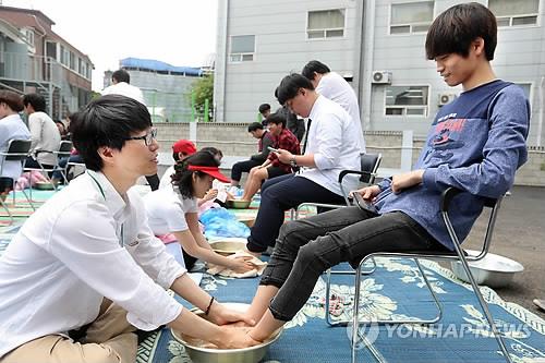 | △ 제자사랑 세족식 (서울=연합뉴스) 김수진 기자 = 스승의날을 하루 앞둔 14일 오전 서울 강서구 성지중고등학교 화곡캠퍼스에서 열린 '제14회 제자사랑 세족식'에서 선생님들이 학생들의 발을 씻겨주고 있다. 2015.5.14 |