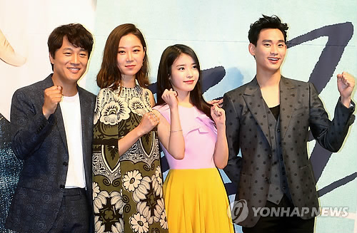 | △ KBS2 예능드라마 '프로듀사' 제작발표회 (서울=연합뉴스) 김수진 기자 = 11일 오후 서울 강남구 역삼동 더라움에서 열린 KBS 2TV 새 드라마 '프로듀사' 제작발표회에서 배우 차태현, 공효진, 아이유, 김수현이 포즈를 취하고 있다. 2015.5.11 ksujin@yna.co.kr |