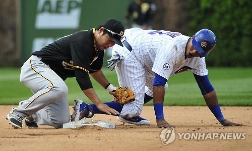 | △ 유격수 강정호(28.피츠버그 파이리츠)가 17일(현지시간) 시카고 컵스와의 경기에서 6회 2루로 도루하던 주자 스탈린 카스트로를 재치 있는 태그로 잡아냈다. 강정호는 카스트로가 가속도를 이기지 못하고 2루를 지나친 틈을 놓치지 않고 그의 몸에 글러브를 댔고, 비디오 판독 결과 세이프 판정은 아웃으로 번복됐다. (AP=연합뉴스) |