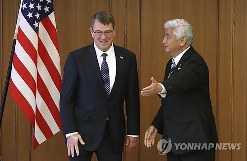 △ 2015년 4월 8일 일본 도쿄도 소재 방위성에서 나카타니 겐(오른쪽) 일본 방위상이 손을 뻗어 애슈턴 카터 미국 국방장관을 안내하고 있다.(AP=연합뉴스 자료사진)