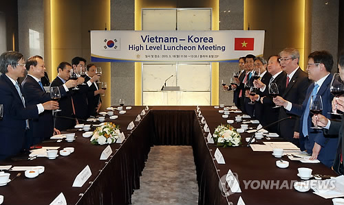 △ 임종룡, 베트남 부총리에 '한국금융사 진출' 협조요청 (서울=연합뉴스) 김주성 기자 = 임종룡 금융위원장이 18일 오전 서울 중구 플라자호텔에서 부 반 닝 베트남 경제부총리가 이끄는 정부대표단과 오찬을 겸한 면담을 하기에 앞서 건배를 하고 있다. 이날 면담에서 임 위원장은 부 반 닝 베트남 경제부총리에게 한국 금융기업의 베트남 진출을 도와달라고 요청했다.