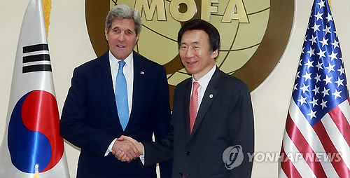 | △ 한·미 외교장관 회담 (서울=연합뉴스) 전수영 기자 = 윤병세 외교부 장관과 존 케리 미국 국무부 장관이 18일 오전 서울 외교부 청사에서 열린 한·미 외교장관 회담에서 악수하고 있다. |