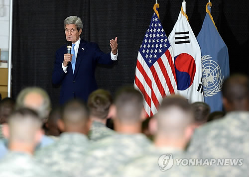 | △ 연설하는 존 케리 미 국무장관 (서울 사진공동취재단=연합뉴스) 존 케리 미국 국무장관이 18일 오후 서울 용산구 주한미군기지를 방문해 주한미군을 대상으로 연설을 하고 있다. |