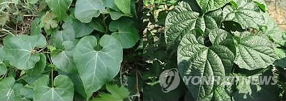 | △ 제주도 농업기술원이 백수오와 이엽우피소 구별 방법을 안내했다. 왼쪽은 백수오 잎으로 단면이 매끄러우며, 오른쪽은 이엽우피소 잎으로 단면이 거칠다. (제주도 농업기술원 제공) |