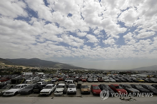 | △ 그리스 '구제금융' 청신호 (아테네 AP=연합뉴스) 그리스 ANA-MPA 통신 등은 19일(현지시간) 알렉시스 치프라스 총리와 야니스 바루파키스 재무장관, 파노스 스쿠레티스 노동장관 등이 채권단과 협상이 며칠 안에 타결될 것으로 잇따라 밝혔다고 보도했다. 그리스는 유럽연합(EU)과 유럽중앙은행(ECB), 국제통화기금(IMF)으로 구성된 채권단과 구제금융 분할금 72억 유로(약 8조8천억원) 지원과 ECB의 그리스 국채 보유에 따른 이익금(19억 유로) 반환을 위해 개혁안을 놓고 협상을 벌여 왔다. 그리스 정부는 이날 실무협상을 마무리하고 21~22일 열리는 'EU-동부파트너십 정상회의'에서 EU 지도자들과 별도 회담을 통한 정치적 타결을 기대하고 있다.사진은 이날 아테네 북부 공공자산관리기구에서 열린 공매에 나온 자동차들. |